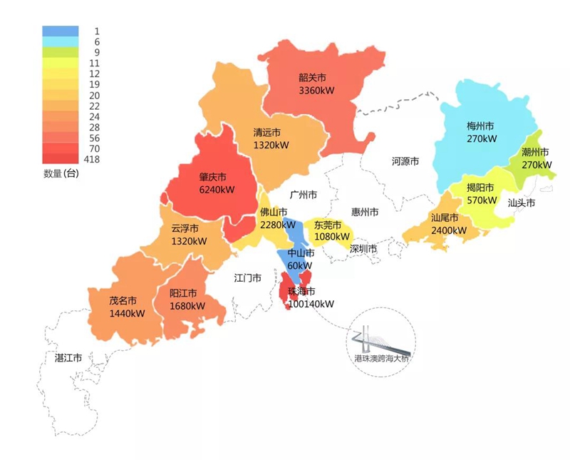 2018年,在港珠澳大桥充电桩项目中,森脉(深圳)国际贸易有限公司在港珠澳大桥珠海端口岸人工岛搭建的充电管理平台及电能量采集终端,为大桥的绿色运营和电力保障提供技术支持。除此之外,仅广东省内,森脉(深圳)国际贸易有限公司充电桩涵盖肇庆、珠海等14个城市,具体分布情况如下图所示。